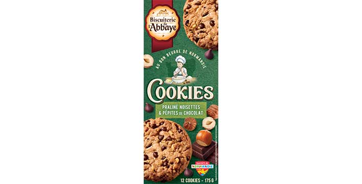 Etui contenant 12 cookies pur beurre aux pépites de chocolat, aux noisettes et au praliné (Poids net : 175g).